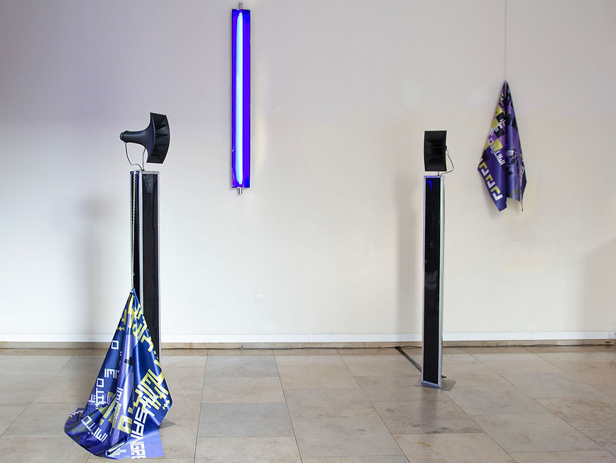 Diversos lemas y elementos gráficos se despliegan en satinadas banderas que exhortan a la acción e invitan a identificarse con la forma de narrar y autodefinirse de estas lenguas. Parecen estandartes guerreros y en cierto sentido lo son, pero también podrían entenderse como pantallas fluidas en las que el tiempo colapsa. Pantallas que abren ventanas intergeneracionales, solapan tiempos históricos y localizaciones geográficas. Son también espejos mágicos que reflejan lo que de ancestral portamos tanto como la abstracción digital, rutilante, en la que vivimos.