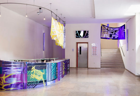 Different phrases and graphic elements unfold on satin banners calling for action and inviting us to identify with the way these languages narrate and define themselves. These banners, resembling warrior standards, also serve as fluid screens where time collapses, opening inter-generational pop-up windows and superimposing historical time periods and geographical locations. They are also magic mirrors that reflect the ancestral element inside us all, as well as the dazzling digital abstraction that we inhabit.